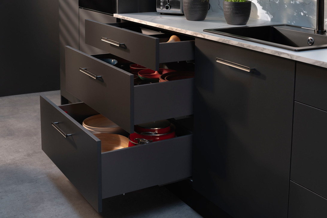 System Häfele Matrix S Slim pozwala maksymalnie wykorzystać przestrzeń kuchenną – nawet w miejscu pod piekarnikiem. Cienkie boki zwiększają pojemność, a pełny wysuw i cichy domyk zapewniają komfort użytkowania każdego dnia. To idealne rozwiązanie dla osób ceniących funkcjonalność, ergonomię i nowoczesny design.
